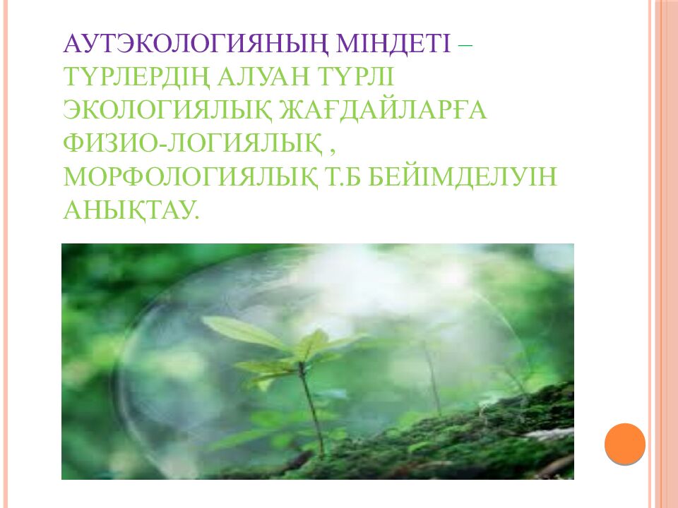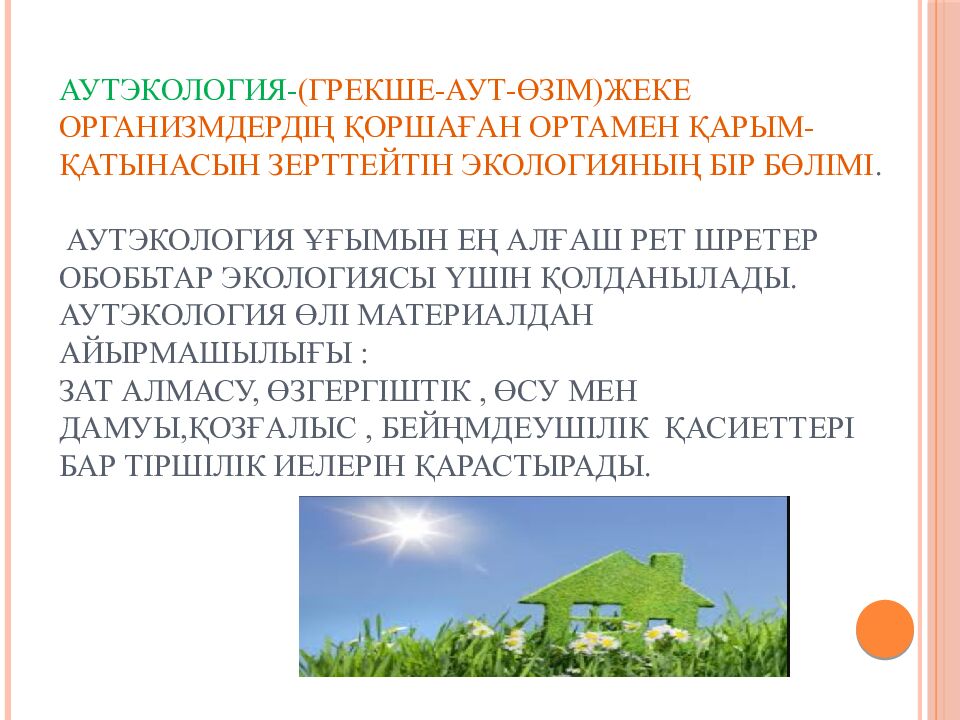 Слайд 11: Аутэкология- (грекше-аут-өзім)жеке организмдердің қоршаған ортамен қарым-қатынасын зерттейтін экологияның бір бөлімі. Аутэкология ұғымын ең алғаш рет Шретер обобьтар экологиясы үшін қолданылады. Аутэкология өлі материалдан айырмашылығы : зат алмасу, өзгергіштік, өсу мен дамуы,қозғалыс, бейңмдеушілік қасиеттері бар тіршілік иелерін қарастырады