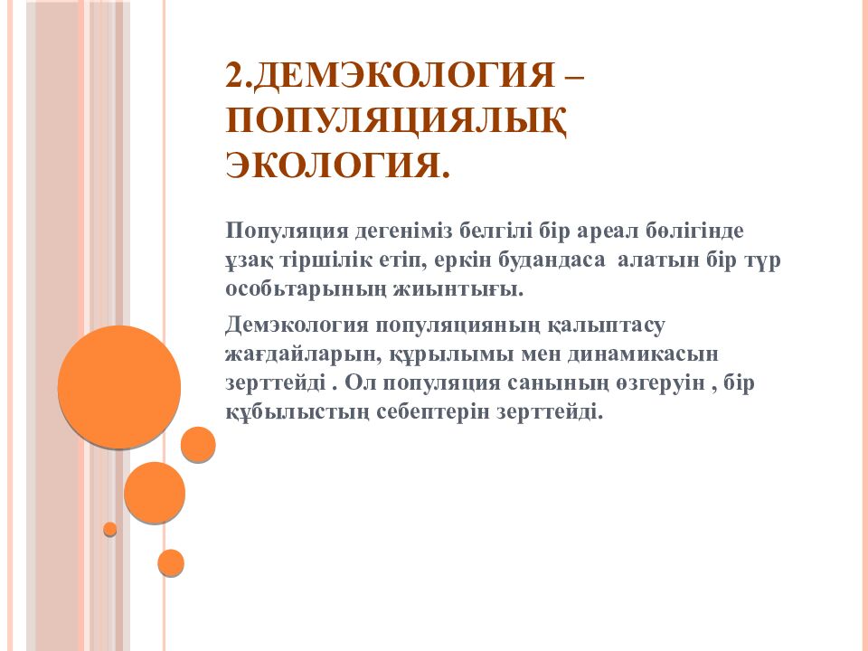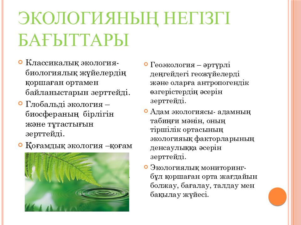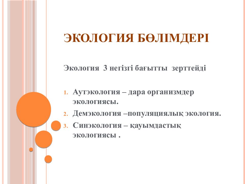 Экология 3 негізгі бағытты зерттейді Аутэкология – дара организмдер экологиясы. Демэкология –популяциялық экология. Синэкология – қауымдастық экологиясы.