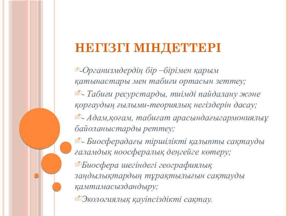 - Организмдердің бір –бірімен қарым қатынастары мен табиғи ортасын зеттеу; - Табиғи ресурстарды, тиімді пайдалану және қорғаудың ғылыми-теориялық негіздерін дасау; - Адам,қоғам, табиғат арасындағыгармониялыұ байоланыстарды реттеу; - Биосферадағы тіршілікті қалыпты сақтауды ғаламдық ноосфералық деңгейге көтеру; Биосфера шегіндегі географиялық заңдылықтардың тұрақтылығын сақтауды қамтамасыздандыру; Экологиялық қауіпсіздікті сақтау.