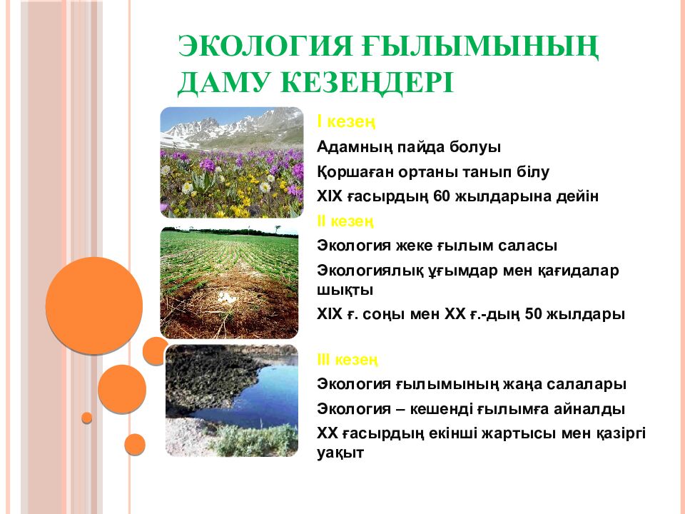 І кезең Адамның пайда болуы Қоршаған ортаны танып білу ХІХ ғасырдың 60 жылдарына дейін ІІ кезең Экология жеке ғылым саласы Экологиялық ұғымдар мен қағидалар шықты ХІХ ғ. соңы мен ХХ ғ.-дың 50 жылдары ІІІ кезең Экология ғылымының жаңа салалары Экология – кешенді ғылымға айналды ХХ ғасырдың екінші жартысы мен қазіргі уақыт