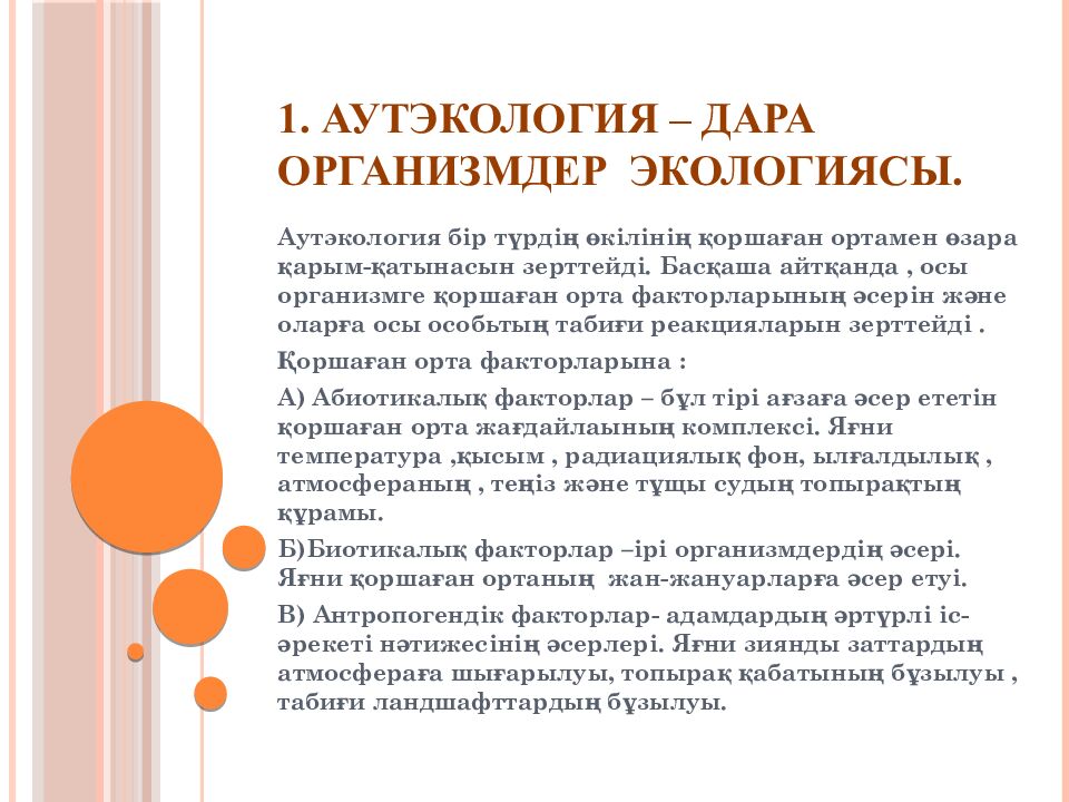 Слайд 10: 1. Аутэкология – дара организмдер экологиясы
