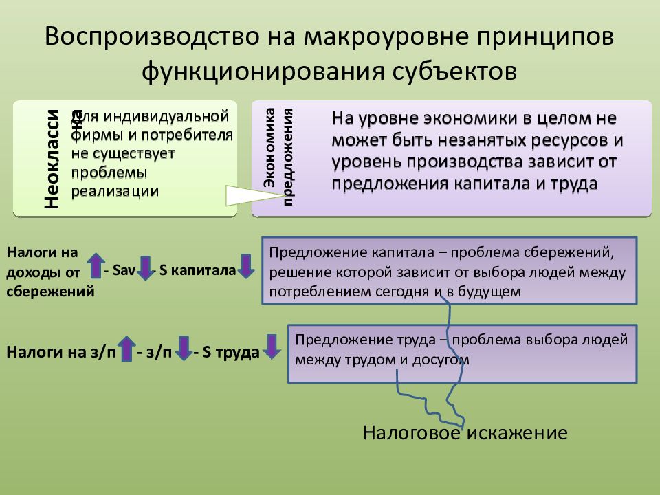 Предложение капитала – проблема сбережений, решение которой зависит от выбора людей между потреблением сегодня и в будущем Предложение труда – проблема выбора людей между трудом и досугом Налоги на з/п - з/п - S труда Налоговое искажение Налоги на доходы от сбережений - Sav - S капитала