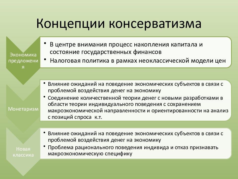 Конец 70-х годов – начало консервативной волны в западном обществе во всех сферах. В политике: курс Д. Рейгана и М. Тэтчер, ориентированный на отказ от чрезмерного вмешательства государства в экономику и возвращение к принципам laissez-faire. В идеологии: традиционалистские моральные ценности (семья, личная ответственность, трудолюбие, бережливость, законопослушание). В экономике же: резкая критика кейнсианства и политики, с ним связанной