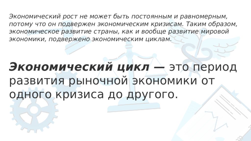 Экономический рост не может быть постоянным и равномерным, потому что он подвержен экономическим кризисам. Таким образом, экономическое развитие страны, как и вообще развитие мировой экономики, подвержено экономическим циклам. Экономический цикл — это период развития рыночной экономики от одного кризиса до другого.