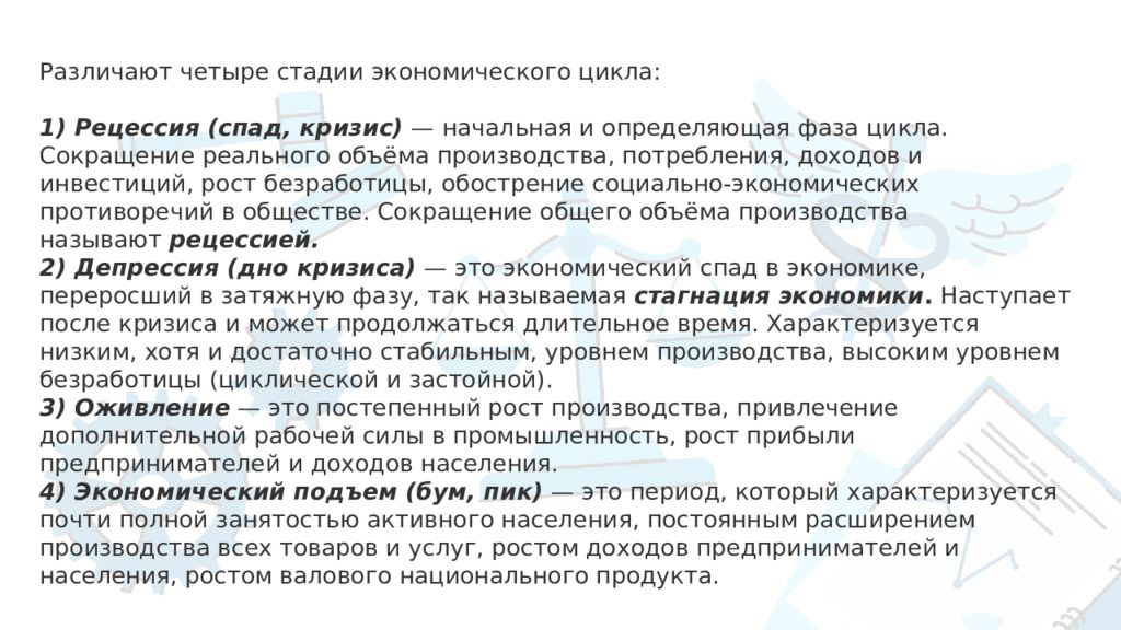 Различают четыре стадии экономического цикла: 1) Рецессия (спад, кризис) — начальная и определяющая фаза цикла. Сокращение реального объёма производства, потребления, доходов и инвестиций, рост безработицы, обострение социально-экономических противоречий в обществе. Сокращение общего объёма производства называют рецессией. 2) Депрессия (дно кризиса) — это экономический спад в экономике, переросший в затяжную фазу, так называемая стагнация экономики. Наступает после кризиса и может продолжаться длительное время. Характеризуется низким, хотя и достаточно стабильным, уровнем производства, высоким уровнем безработицы (циклической и застойной). 3) Оживление — это постепенный рост производства, привлечение дополнительной рабочей силы в промышленность, рост прибыли предпринимателей и доходов населения. 4) Экономический подъем (бум, пик) — это период, который характеризуется почти полной занятостью активного населения, постоянным расширением производства всех товаров и услуг, ростом доходов предпринимателей и населения, ростом валового национального продукта.