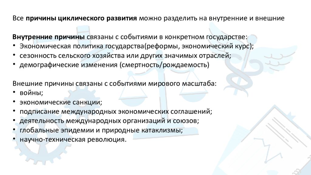 Все причины циклического развития можно разделить на внутренние и внешние Внутренние причины связаны с событиями в конкретном государстве: Экономическая политика государства(реформы, экономический курс); с езонность сельского хозяйства или других значимых отраслей; демографические изменения (смертность/рождаемость) Внешние причины связаны с событиями мирового масштаба: войны; экономические санкции; подписание международных экономических соглашений; д еятельность международных организаций и союзов; г лобальные эпидемии и природные катаклизмы; н аучно-техническая революция.