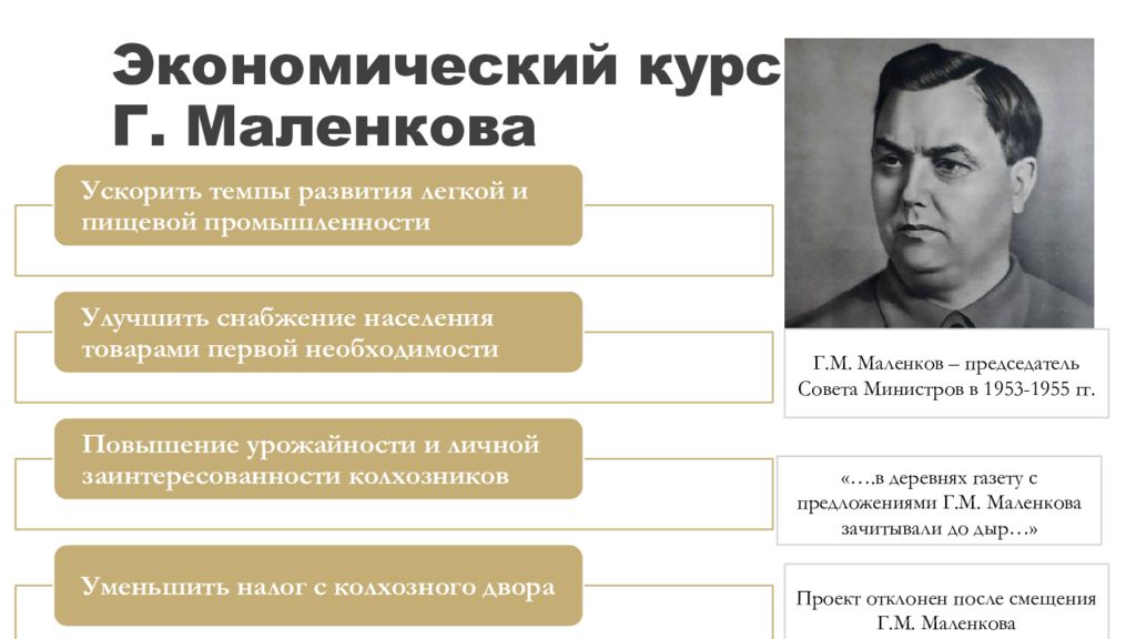 Г.М. Маленков – председатель Совета Министров в 1953-1955 гг. «….в деревнях газету с предложениями Г.М. Маленкова зачитывали до дыр…» Проект отклонен после смещения Г.М. Маленкова