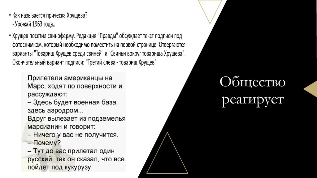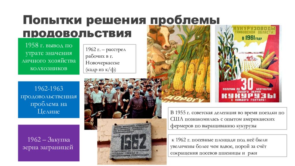 В 1955 г. советская делегация во время поездки по США познакомилась с опытом американских фермеров по выращиванию кукурузы к 1962 г. посевные площади под неё были увеличены более чем вдвое, порой за счёт сокращения посевов пшеницы и ржи 1962 г. – расстрел рабочих в г. Новочеркасске (кадр из к / ф)