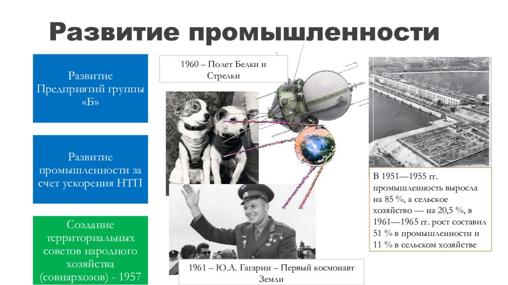 1961 – Ю.А. Гагарин – Первый космонавт Земли 1960 – Полет Белки и Стрелки В 1951—1955 гг. промышленность выросла на 85 %, а сельское хозяйство — на 20,5 %, в 1961—1965 гг. рост составил 51 % в промышленности и 11 % в сельском хозяйстве