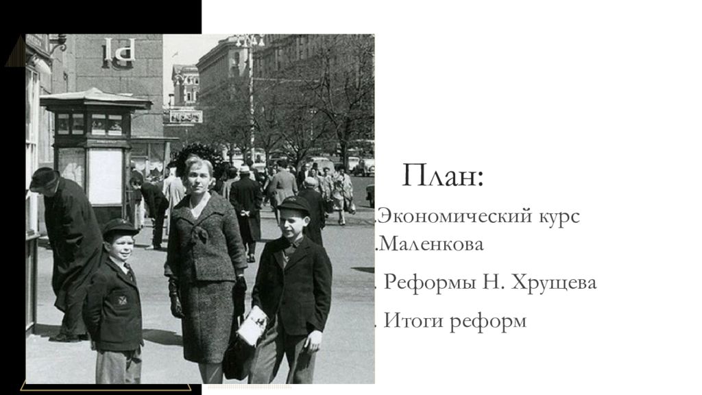 1.Экономический курс Г.Маленкова 2. Реформы Н. Хрущева 3. Итоги реформ