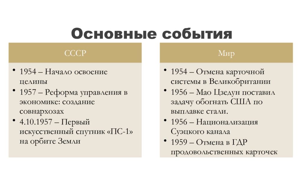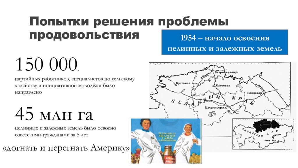 1954 – начало освоения целинных и залежных земель 150 000. партийных работников, специалистов по сельскому хозяйству и инициативной молодёжи было направлено 45 млн га. целинных и залежных земель было освоено советскими гражданами за 5 лет «догнать и перегнать Америку»