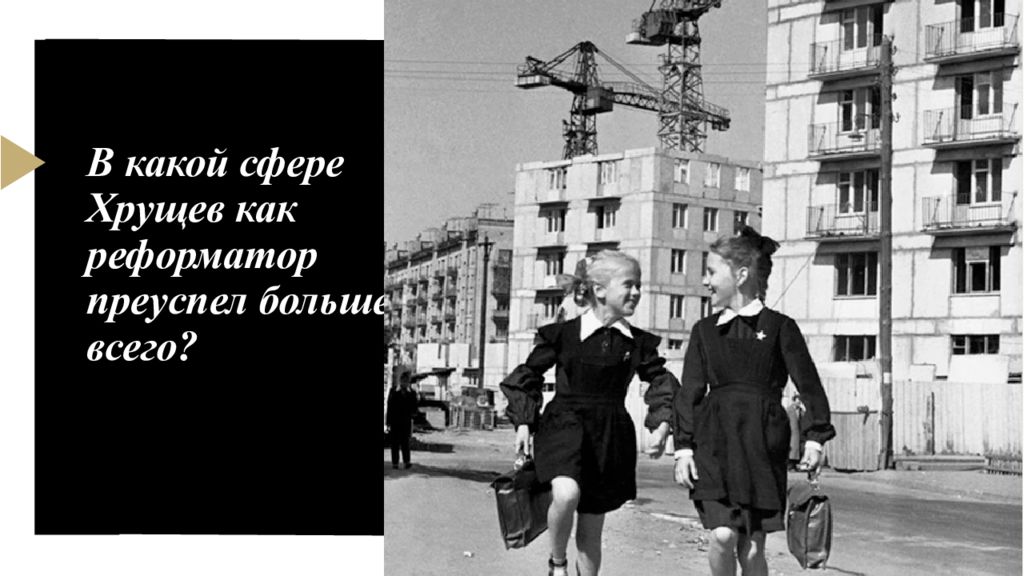 54 млн человек справили новоселье Укрепилась материальная база науки, образования, здравоохранения и культуры. жилищный фонд с 1955 по 1964 г. увеличился на 80 % Распространение « Хрущевок »