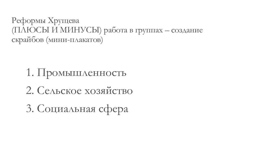 Слайд 6: Реформы Хрущева (ПЛЮСЫ И МИНУСЫ) работа в группах – создание скрайбов (мини-плакатов)