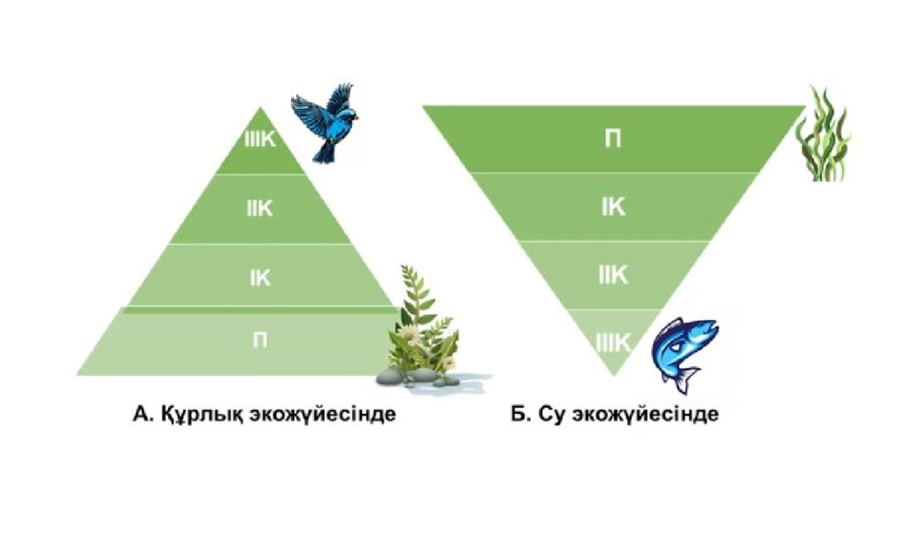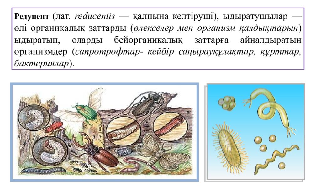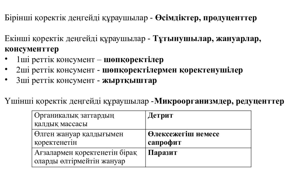 Бірінші қоректік деңгейді құраушылар - Өсімдіктер, продуценттер Екінші қоректік деңгейді құраушылар - Тұтынушылар, жануарлар, консументтер 1ші реттік консумент – шөпқоректілер 2ші реттік консумент - шөпқоректілермен қоректенушілер 3ші реттік консумент - жыртқыштар Үшінші қоректік деңгейді құраушылар - Микроорганизмдер, редуценттер Органикалық заттардың қалдық массасы Детрит Өлген жануар қалдығымен қоректенетін Өлексежегіш немесе сапрофит Ағзалармен қоректенетін бірақ оларды өлтірмейтін жануар Паразит
