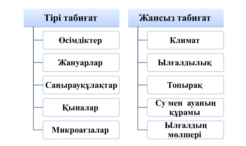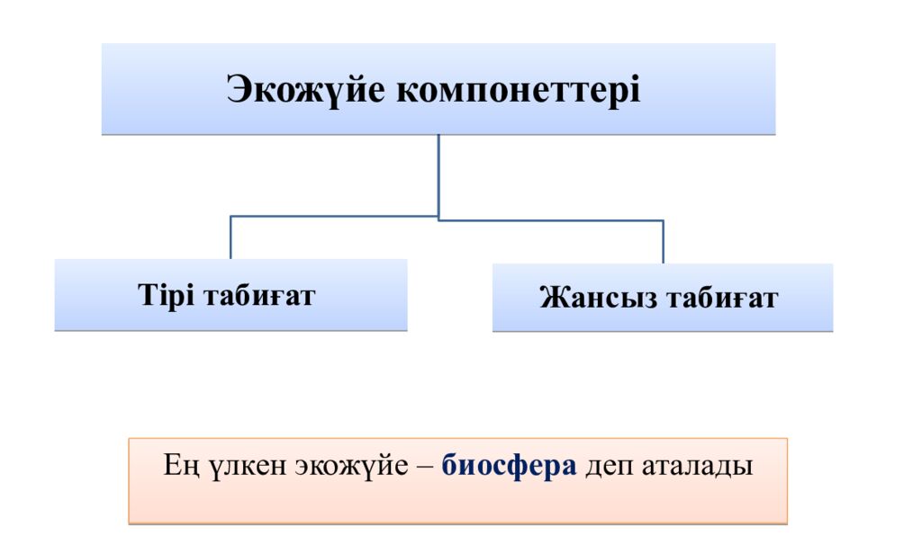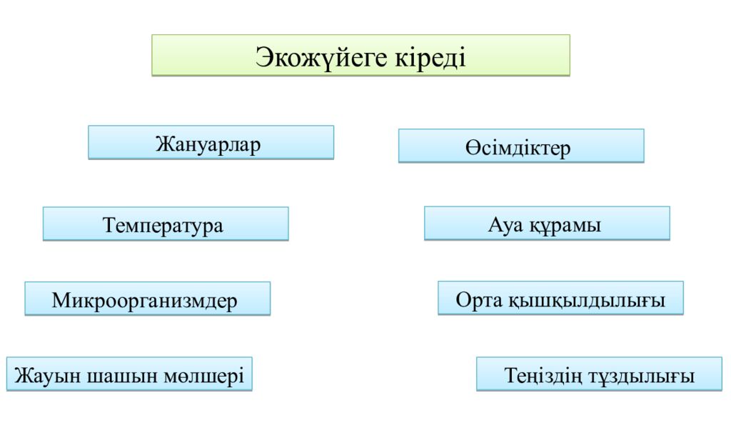 Экожүйеге кіреді Жануарлар Өсімдіктер Микроорганизмдер Температура Жауын шашын мөлшері Ауа құрамы Орта қышқылдылығы Теңіздің тұздылығы