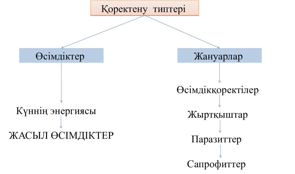Қоректену типтері Өсімдіктер Жануарлар Күннің энергиясы ЖАСЫЛ ӨСІМДІКТЕР Өсімдікқоректілер Жыртқыштар Паразиттер Сапрофиттер