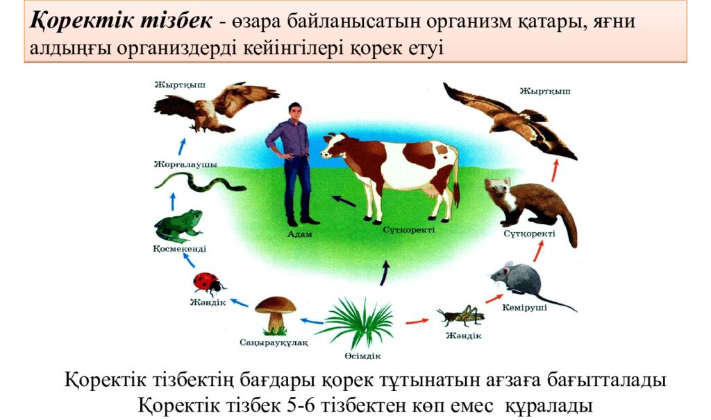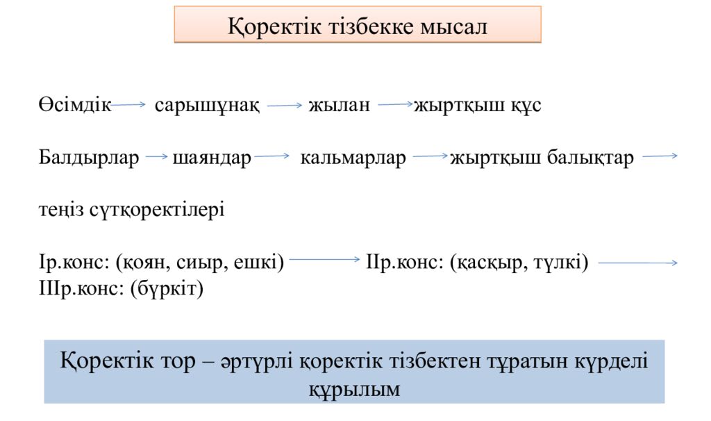 Қоректік тізбек - өзара байланысатын организм қатары, яғни алдыңғы организдерді кейінгілері қорек етуі Қоректік тізбектің бағдары қорек тұтынатын ағзаға бағытталады Қоректік тізбек 5-6 тізбектен көп емес құралады