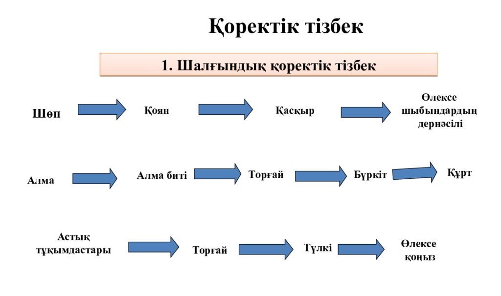 1. Шалғындық қоректік тізбек Қасқыр Алма Шөп Қоян Алма биті Торғай Бүркіт Өлексе шыбындардың дернәсілі Құрт Астық тұқымдастары Торғай Түлкі Өлексе қоңыз Қоректік тізбек