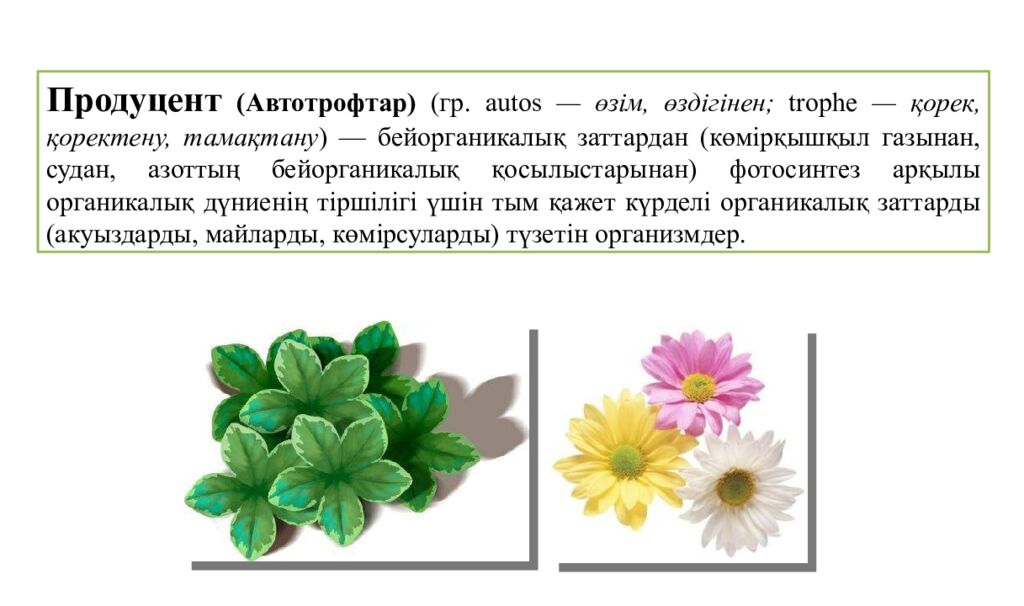 Продуцент ( Автотрофтар ) (гр. autos — өзім, өздігінен; trophe — қорек, қоректену, тамақтану ) — бейорганикалық заттардан ( көмірқышқыл газынан, судан, азоттың бейорганикалық қосылыстарынан ) фотосинтез арқылы органикалық дүниенің тіршілігі үшін тым қажет күрделі органикалық заттарды ( акуыздарды, майларды, көмірсуларды ) түзетін организмдер.