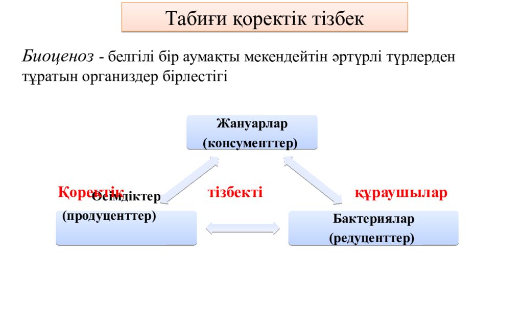 Табиғи қоректік тізбек Биоценоз - белгілі бір аумақты мекендейтін әртүрлі түрлерден тұратын организдер бірлестігі Жануарлар (консументтер) Бактериялар (редуценттер) Өсімдіктер (продуценттер) Қоректік тізбекті құраушылар