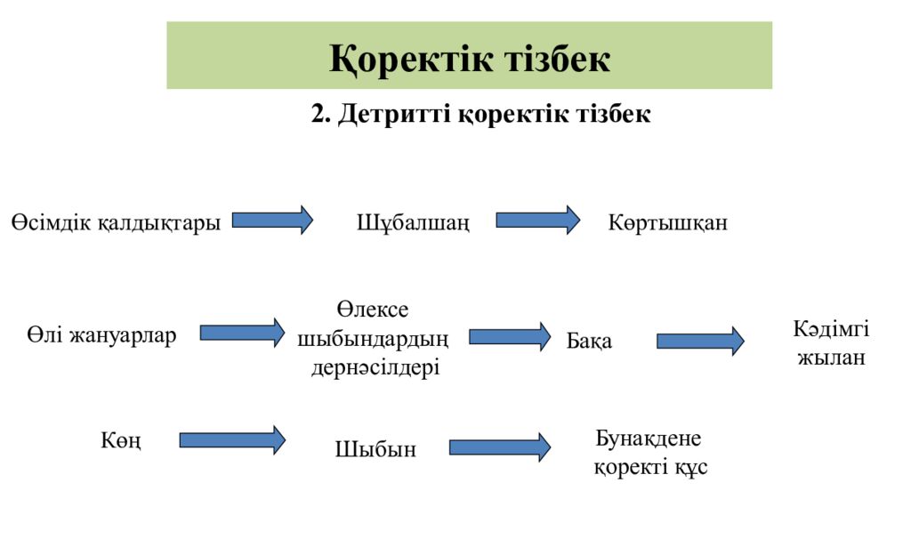 2. Детритті қоректік тізбек Өсімдік қалдықтары Шұбалшаң Көртышқан Өлі жануарлар Өлексе шыбындардың дернәсілдері Кәдімгі жылан Көң Шыбын Бунақдене қоректі құс Қоректік тізбек Бақа