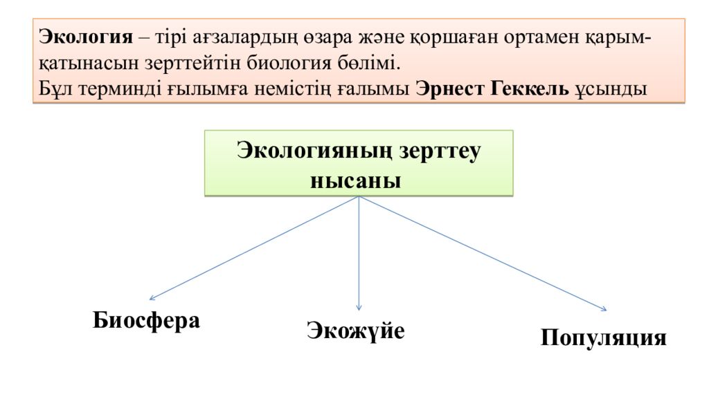 Экология – тірі ағзалардың өзара және қоршаған ортамен қарым-қатынасын зерттейтін биология бөлімі. Бұл терминді ғылымға немістің ғалымы Эрнест Геккель ұсынды Экологияның зерттеу нысаны Биосфера Экожүйе Популяция