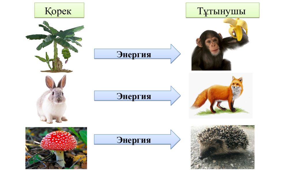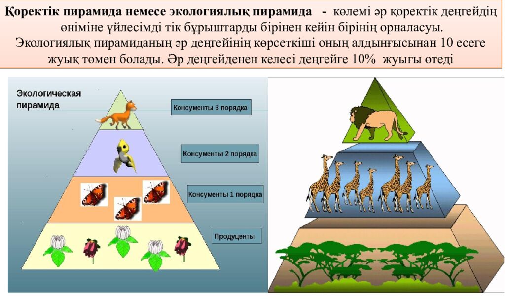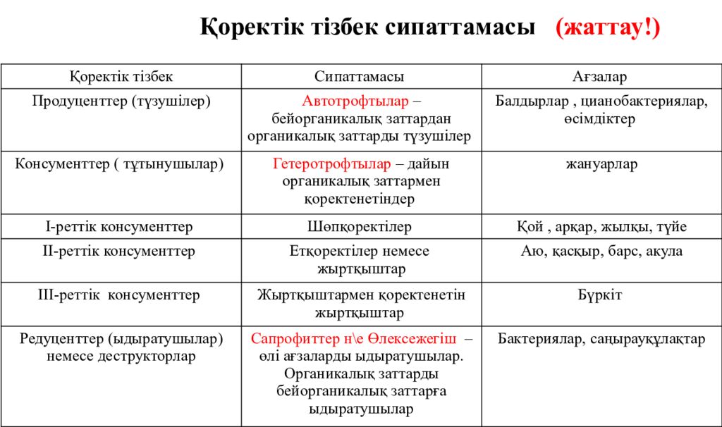 Қоректік тізбек сипаттамасы (жаттау!) Қоректік тізбек Сипаттамасы Ағзалар Продуценттер (түзушілер) Автотрофтылар – бейорганикалық заттардан органикалық заттарды түзушілер Балдырлар, цианобактериялар, өсімдіктер Консументтер ( тұтынушылар) Гетеротрофтылар – дайын органикалық заттармен қоректенетіндер жануарлар І-реттік консументтер Шөпқоректілер Қой, арқар, жылқы, түйе ІІ-реттік консументтер Етқоректілер немесе жыртқыштар Аю, қасқыр, барс, акула ІІІ-реттік консументтер Жыртқыштармен қоректенетін жыртқыштар Бүркіт Редуценттер (ыдыратушылар) немесе деструкторлар Сапрофиттер н\е Өлексежегіш – өлі ағзаларды ыдыратушылар. Органикалық заттарды бейорганикалық заттарға ыдыратушылар Бактериялар, саңырауқұлақтар