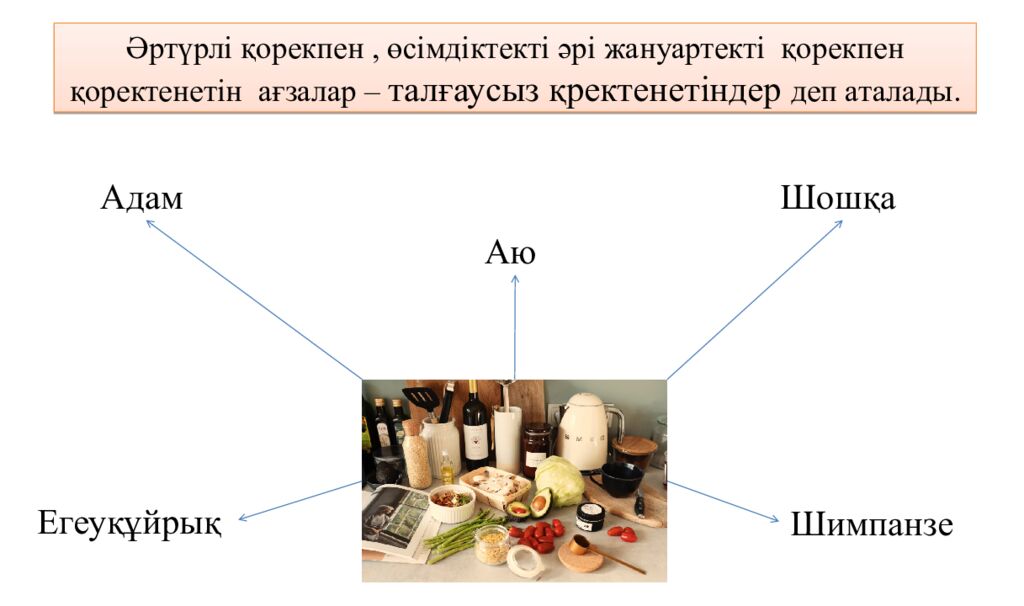 Әртүрлі қорекпен, өсімдіктекті әрі жануартекті қорекпен қоректенетін ағзалар – талғаусыз қректенетіндер деп аталады. Адам Егеуқұйрық Шошқа Аю Шимпанзе