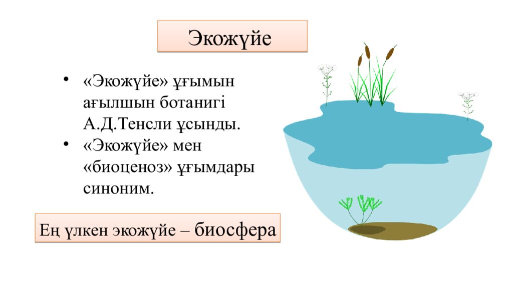 Экожүйе «Экожүйе» ұғымын ағылшын ботанигі А.Д.Тенсли ұсынды. «Экожүйе» мен «биоценоз» ұғымдары синоним. Ең үлкен экожүйе – биосфера