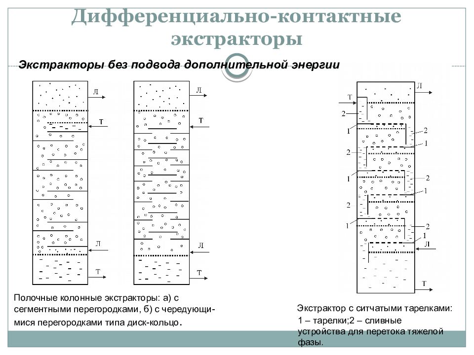 Полочные колонные экстракторы: а) с сегментными перегородками, б) с чередующи-мися перегородками типа диск-кольцо. Экстрактор с ситчатыми тарелками: 1 – тарелки;2 – сливные устройства для перетока тяжелой фазы. Экстракторы без подвода дополнительной энергии