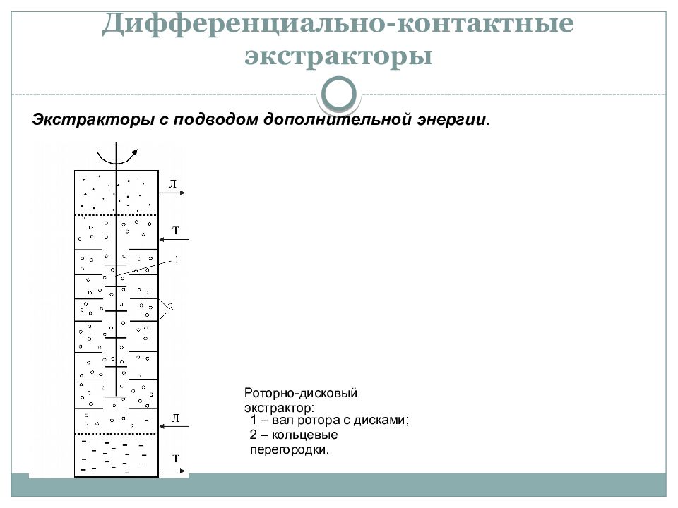 Экстракторы с подводом дополнительной энергии. Роторно-дисковый экстрактор: 1 – вал ротора с дисками; 2 – кольцевые перегородки.