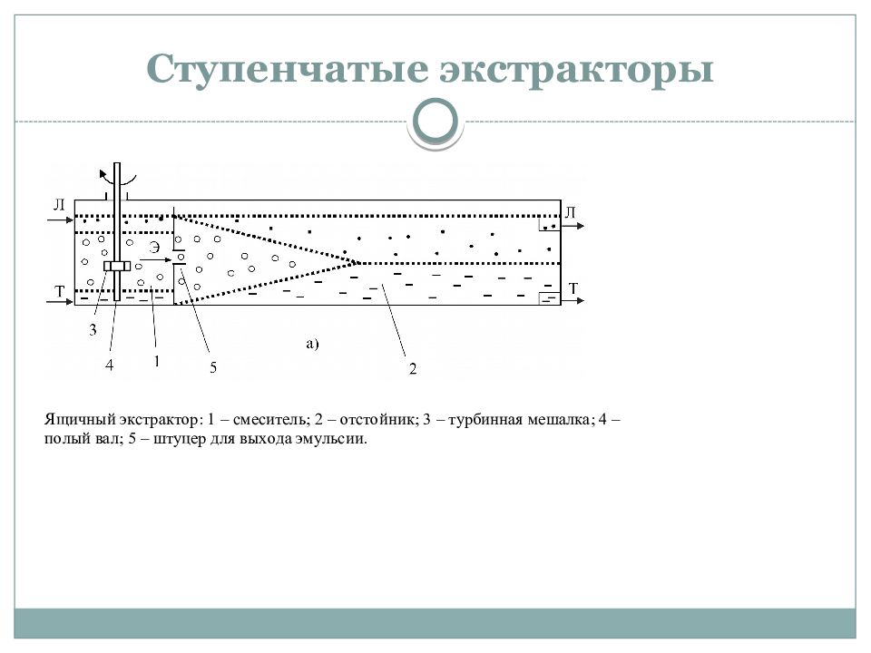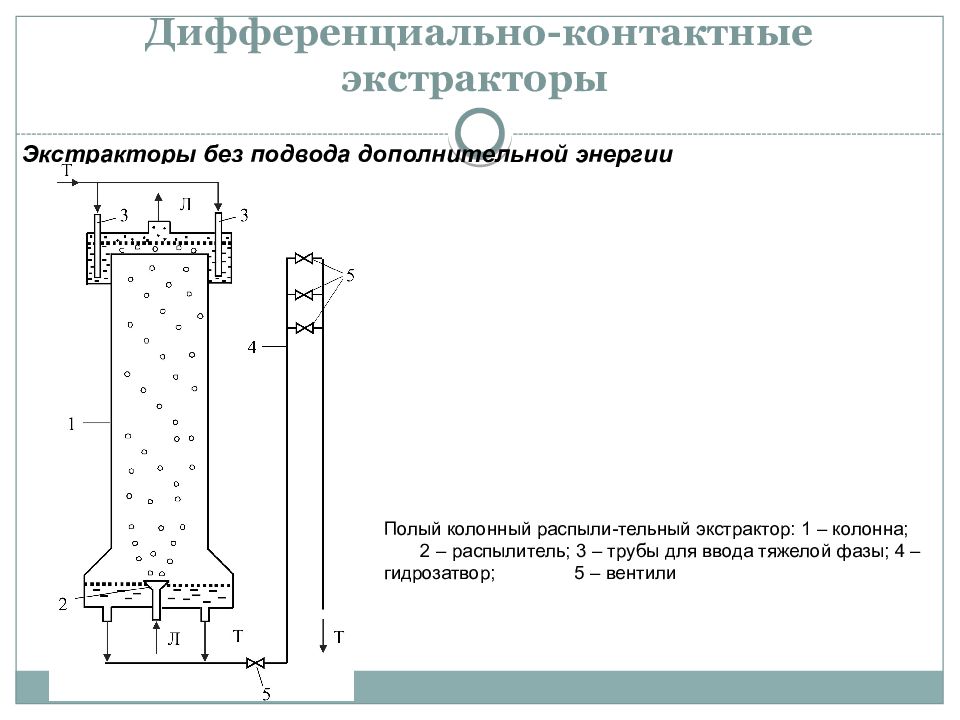 Экстракторы без подвода дополнительной энергии Полый колонный распыли-тельный экстрактор: 1 – колонна; 2 – распылитель; 3 – трубы для ввода тяжелой фазы; 4 – гидрозатвор; 5 – вентили