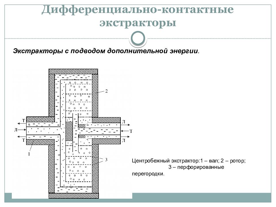По способу проведения процесса экстракторы можно подразделить на: - ступенчатые, в которых фазы достигают состояния близкого к равновесному (ступенчатая экстракция); - дифференциально-контактные, в которых фазы движутся противотоком друг к другу в неравновесных условиях (непрерывная противоточная экстракция). В зависимости от источника энергии, используемой для диспергирования и перемещения фаз, экстракторы подразделяются на: - аппараты без подвода дополнительной энергии; с подводом дополнительной энергии. В зависимости от рода сил, под действием которых происходит сепарация фаз, различают: гравитационные; центробежные экстракторы.