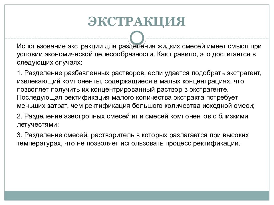 Использование экстракции для разделения жидких смесей имеет смысл при условии экономической целесообразности. Как правило, это достигается в следующих случаях: 1. Разделение разбавленных растворов, если удается подобрать экстрагент, извлекающий компоненты, содержащиеся в малых концентрациях, что позволяет получить их концентрированный раствор в экстрагенте. Последующая ректификация малого количества экстракта потребует меньших затрат, чем ректификация большого количества исходной смеси; 2. Разделение азеотропных смесей или смесей компонентов с близкими летучестями; 3. Разделение смесей, растворитель в которых разлагается при высоких температурах, что не позволяет использовать процесс ректификации.