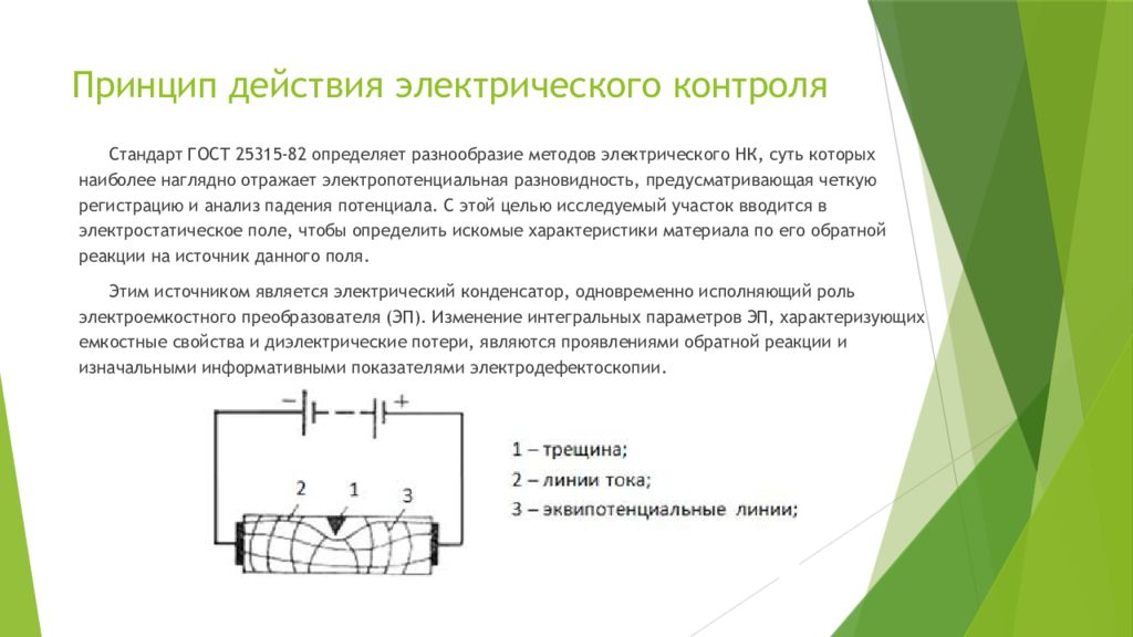 Стандарт ГОСТ 25315-82 определяет разнообразие методов электрического НК, суть которых наиболее наглядно отражает электропотенциальная разновидность, предусматривающая четкую регистрацию и анализ падения потенциала. С этой целью исследуемый участок вводится в электростатическое поле, чтобы определить искомые характеристики материала по его обратной реакции на источник данного поля. Этим источником является электрический конденсатор, одновременно исполняющий роль электроемкостного преобразователя (ЭП). Изменение интегральных параметров ЭП, характеризующих емкостные свойства и диэлектрические потери, являются проявлениями обратной реакции и изначальными информативными показателями электродефектоскопии.