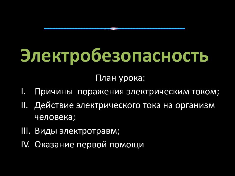 План урока: Причины поражения электрическим током; Действие электрического тока на организм человека; Виды электротравм ; Оказание первой помощи