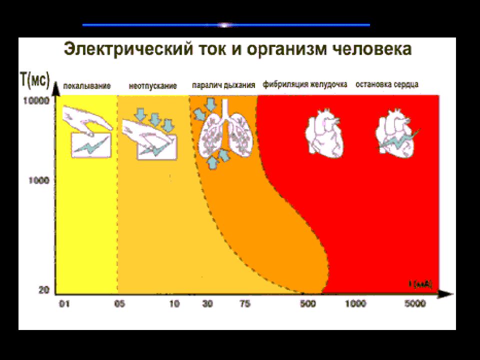 Сила тока, мА Переменный ток 50 — 60 Гц Постоянный ток 0,6 — 1,5 Начало ощущения - слабый зуд, пощипывание кожи Не ощущается 2 — 3 Ощущение тока распространяется и на запястье руки, слегка сводит руку Не ощущается 5 - 7 Болевые ощущения, судороги в руках 3y д. Ощущение нагревания 8 — 10 Руки с трудом, но еще можно оторвать от электродов. Сильные боли в руках и судороги Усиление нагревания 20 — 25 Руки парализуются мгновенно, оторвать их от электродов невозможно. Очень сильные боли в руках и груди. Затрудняется дыхание Еще большее усиление нагревания, незначительное сокращение мышц рук 50 — 80 Дыхание парализуется. Начало трепетания желудочков сердца Сильное ощущение нагревания. Сокращение мышц рук. Судороги. Затруднение дыхания 90 — 100 Паралич дыхания и фибрилляция через 1-3 с. Паралич дыхания