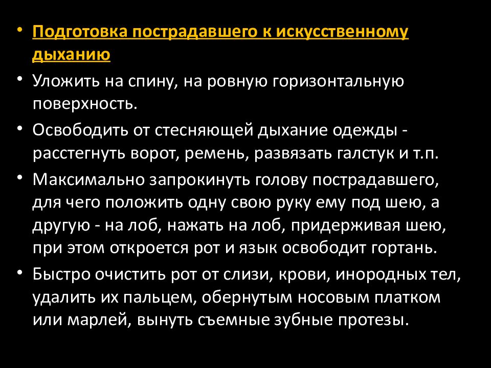 Пoдготовкa пострадавшего к иcкуcственному дыханию Уложить на спину, на ровную горизонтальную поверхность. Освободить от стесняющей дыхание одежды - расстегнуть ворот, ремень, развязать галстук и т.п. Максимально запрокинуть голову пострадавшего, для чего положить одну свою руку ему под шею, а другую - на лоб, нажать на лоб, придерживая шею, при этом откроется рот и язык освободит гортань. Быстро очистить рот от слизи, крови, инородных тел, удалить их пальцем, обернутым носовым платком или марлей, вынуть съемные зубные протезы.