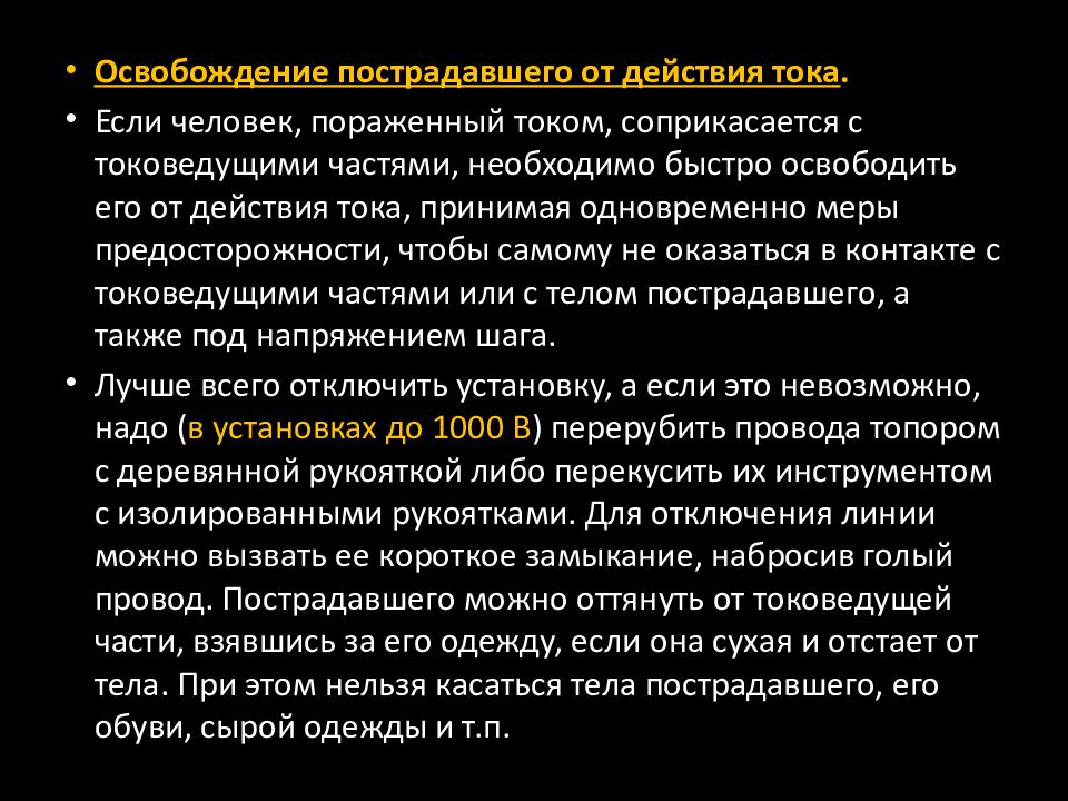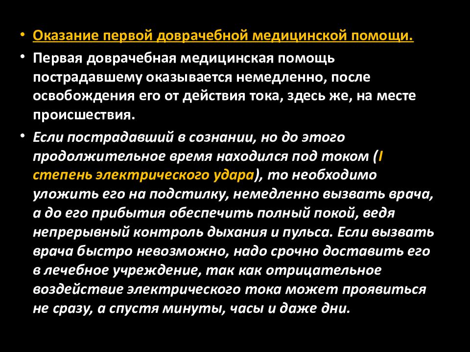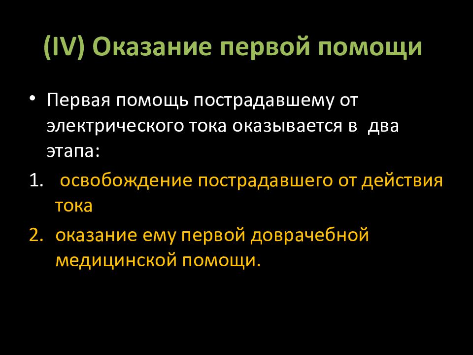 Первая помощь пострадавшему от электрического тока оказывается в два этапа: освобождение пострадавшего от действия тока оказание ему первой доврачебной медицинской помощи.