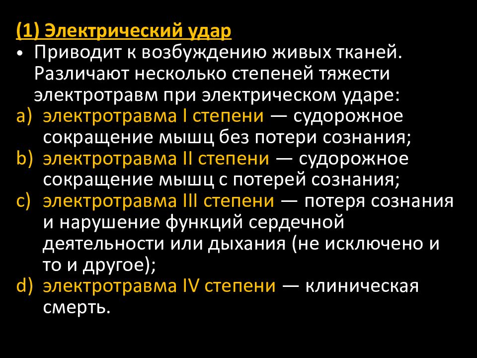 (1) Электрический удар Приводит к возбуждению живых тканей. Различают несколько степеней тяжести электротравм при электрическом ударе: электротравма I степени — судорожное сокращение мышц без потери сознания; электротравма II степени — судорожное сокращение мышц с потерей сознания; электротравма III степени — потеря сознания и нарушение функций сердечной деятельности или дыхания (не исключено и то и другое); электротравма IV степени — клиническая смерть.