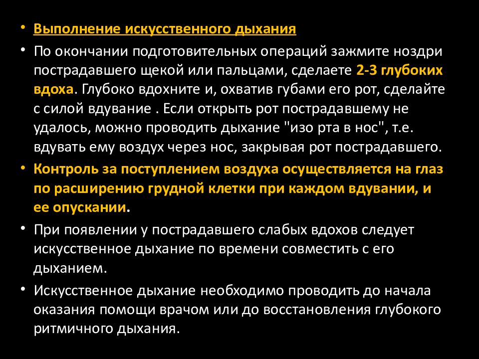 Выполнение искусственного дыхания По окончании подготовительных операций зажмите ноздри пострадавшего щекой или пальцами, сделаете 2-3 глубоких вдоха. Глубоко вдохните и, охватив губами его рот, сделайте с силой вдувание. Если открыть рот пострадавшему не удалось, можно проводить дыхание "изо рта в нос", т.е. вдувать ему воздух через нос, закрывая рот пострадавшего. Контроль за поступлением воздуха осуществляется на глаз по расширению грудной клетки при каждом вдувании, и ее опускании. При появлении у пострадавшего слабых вдохов следует искусственное дыхание по времени совместить с его дыханием. Искусственное дыхание необходимо проводить до начала оказания помощи врачом или до восстановления глубокого ритмичного дыхания.