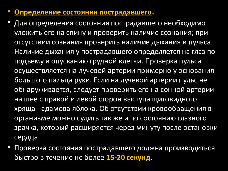 Определение состояния пострадавшего. Для определения состояния пострадавшего необходимо уложить его на спину и проверить наличие сознания; при отсутствии сознания проверить наличие дыхания и пульса. Наличие дыхания у пострадавшего определяется на глаз по подъему и опусканию грудной клетки. Проверка пульса осуществляется на лучевой артерии примерно у основания большого пальца руки. Если на лучевой артерии пульс не обнаруживается, следует проверить его на сонной артерии на шее с правой и левой сторон выступа щитовидного хряща - адамова яблока. Об отсутствии кровообращения в организме можно судить так же и по состоянию глазного зрачка, который расширяется через минуту после остановки сердца. Проверка состояния пострадавшего должна производиться быстро в течение не более 15-20 секунд.