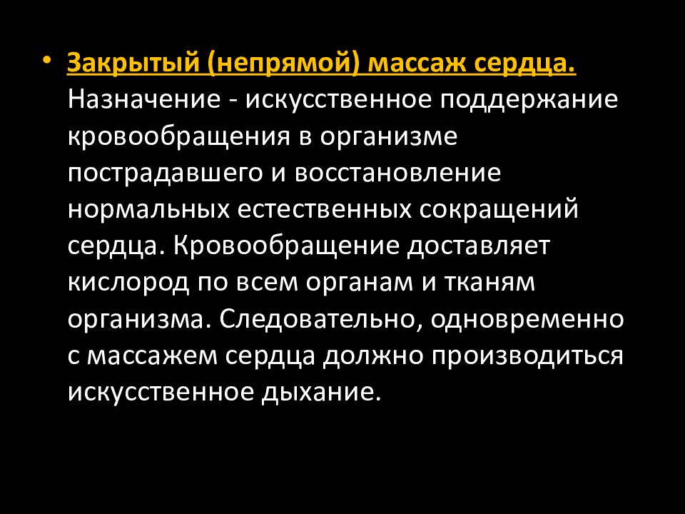 Закрытый (непрямой) массаж сердца. Назначение - искусственное поддержание кровообращения в организме пострадавшего и восстановление нормальных естественных сокращений сердца. Кровообращение доставляет кислород по всем органам и тканям организма. Следовательно, одновременно с массажем сердца должно производиться искусственное дыхание.