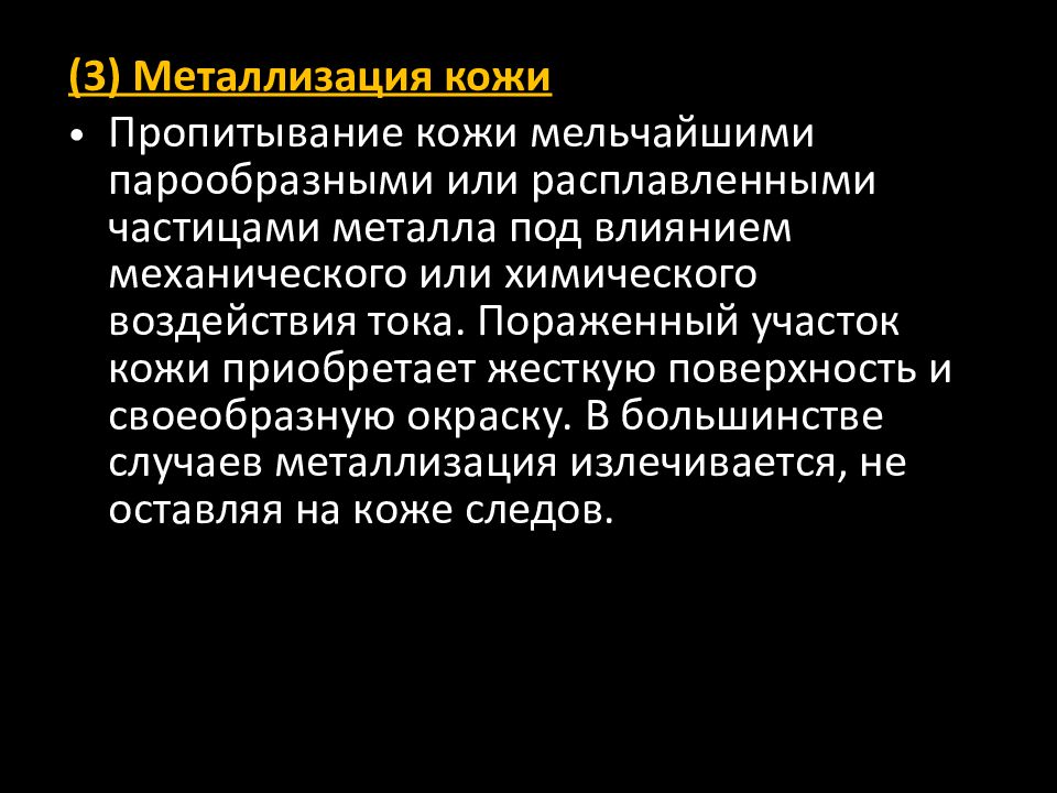 (3) Металлизация кожи Пропитывание кожи мельчайшими парообразными или расплавленными частицами металла под влиянием механического или химического воздействия тока. Пораженный участок кожи приобретает жесткую поверхность и своеобразную окраску. В большинстве случаев металлизация излечивается, не оставляя на коже следов.
