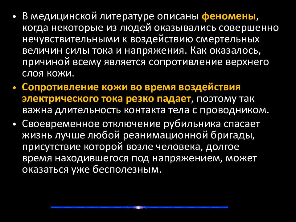 В медицинской литературе описаны феномены, когда некоторые из людей оказывались совершенно нечувствительными к воздействию смертельных величин силы тока и напряжения. Как оказалось, причиной всему является сопротивление верхнего слоя кожи. Сопротивление кожи во время воздействия электрического тока резко падает, поэтому так важна длительность контакта тела с проводником. Своевременное отключение рубильника спасает жизнь лучше любой реанимационной бригады, присутствие которой возле человека, долгое время находившегося под напряжением, может оказаться уже бесполезным.