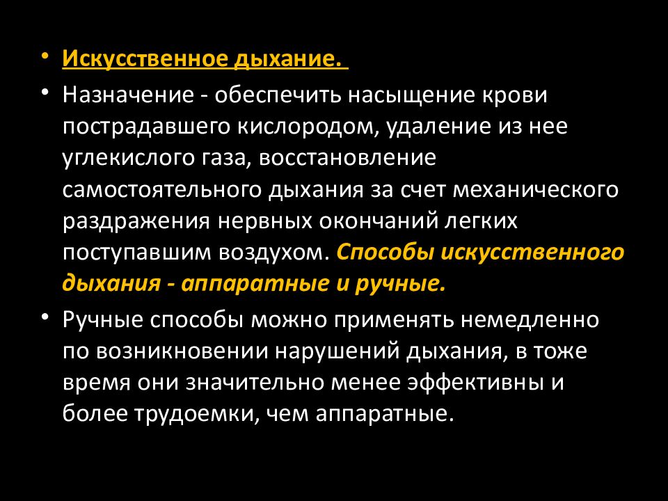 Искусственное дыхание. Назначение - обеспечить насыщение крови пострадавшего кислородом, удаление из нее углекислого газа, восстановление самостоятельного дыхания за счет механического раздражения нервных окончаний легких поступавшим воздухом. Способы искусственного дыхания - аппаратные и ручные. Ручные способы можно применять немедленно по возникновении нарушений дыхания, в тожe время они значительно менее эффективны и более трудоемки, чем аппаратные.