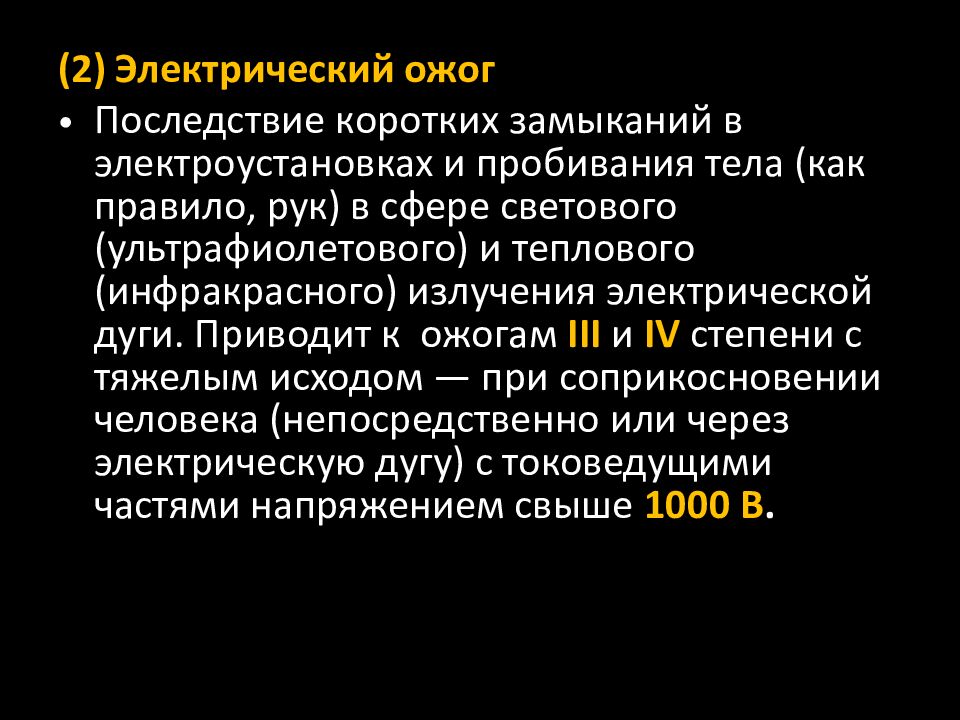 (2) Электрический ожог Последствие коротких замыканий в электроустановках и пробивания тела (как правило, рук) в сфере светового (ультрафиолетового) и теплового (инфракрасного) излучения электрической дуги. Приводит к ожогам III и IV степени с тяжелым исходом — при соприкосновении человека (непосредственно или через электрическую дугу) с токоведущими частями напряжением свыше 1000 В.