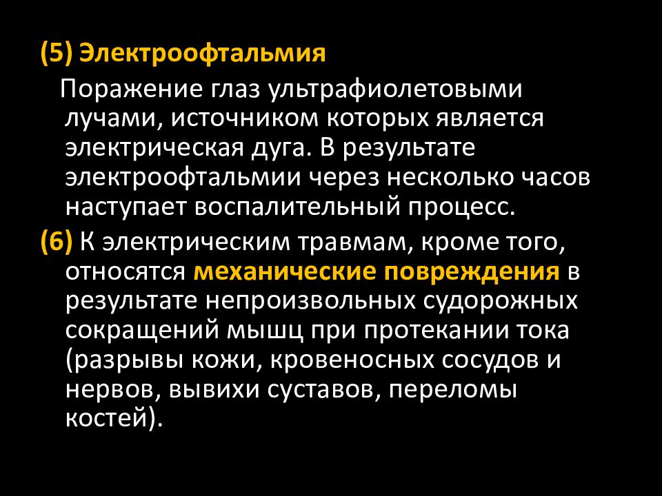 (5) Электроофтальмия Поражение глаз ультрафиолетовыми лучами, источником которых является электрическая дуга. В результате электроофтальмии через несколько часов наступает воспалительный процесс. (6) К электрическим травмам, кроме того, относятся механические повреждения в результате непроизвольных судорожных сокращений мышц при протекании тока (разрывы кожи, кровеносных сосудов и нервов, вывихи суставов, переломы костей ).