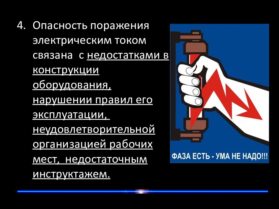 Опасность поражения электрическим током связана с недостатками в конструкции оборудования, нарушении правил его эксплуатации, неудовлетворительной организацией рабочих мест, недостаточным инструктажем.
