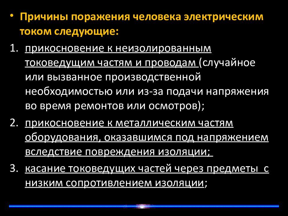 Причины поражения человека электрическим током следующие: прикосновение к неизолированным токоведущим частям и проводам (случайное или вызванное производственной необходимостью или из-за подачи напряжения во время ремонтов или осмотров); прикосновение к металлическим частям оборудования, оказавшимся под напряжением вследствие повреждения изоляции; касание токоведущих частей через предметы с низким сопротивлением изоляции ;